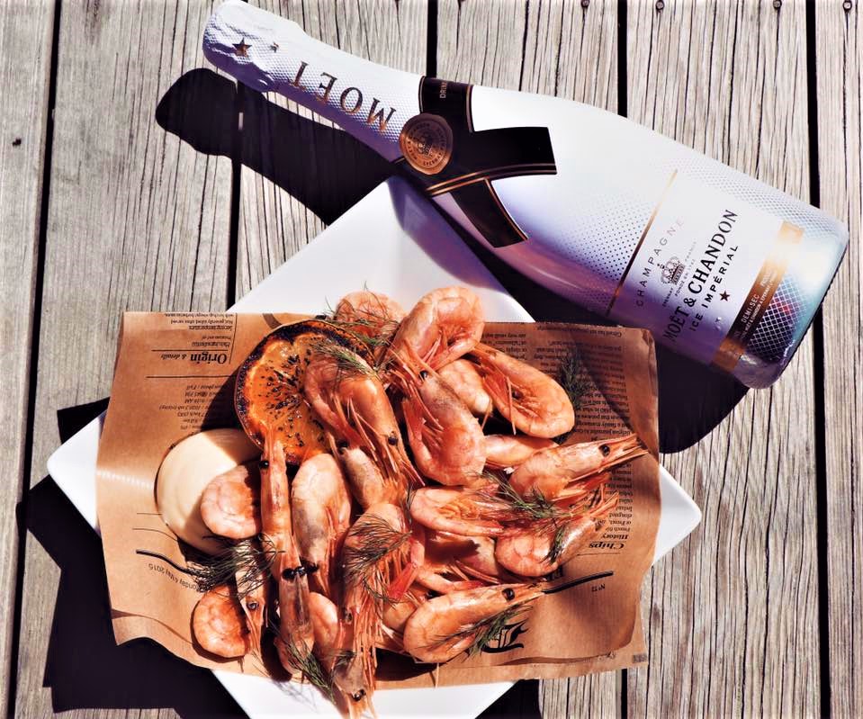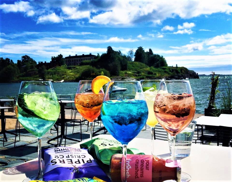 Eine Champagner-Bar am Ufer des Kaivopuisto, an der Meerenge zwischen den wunderschönen Inseln Uunisaari und Harakka.