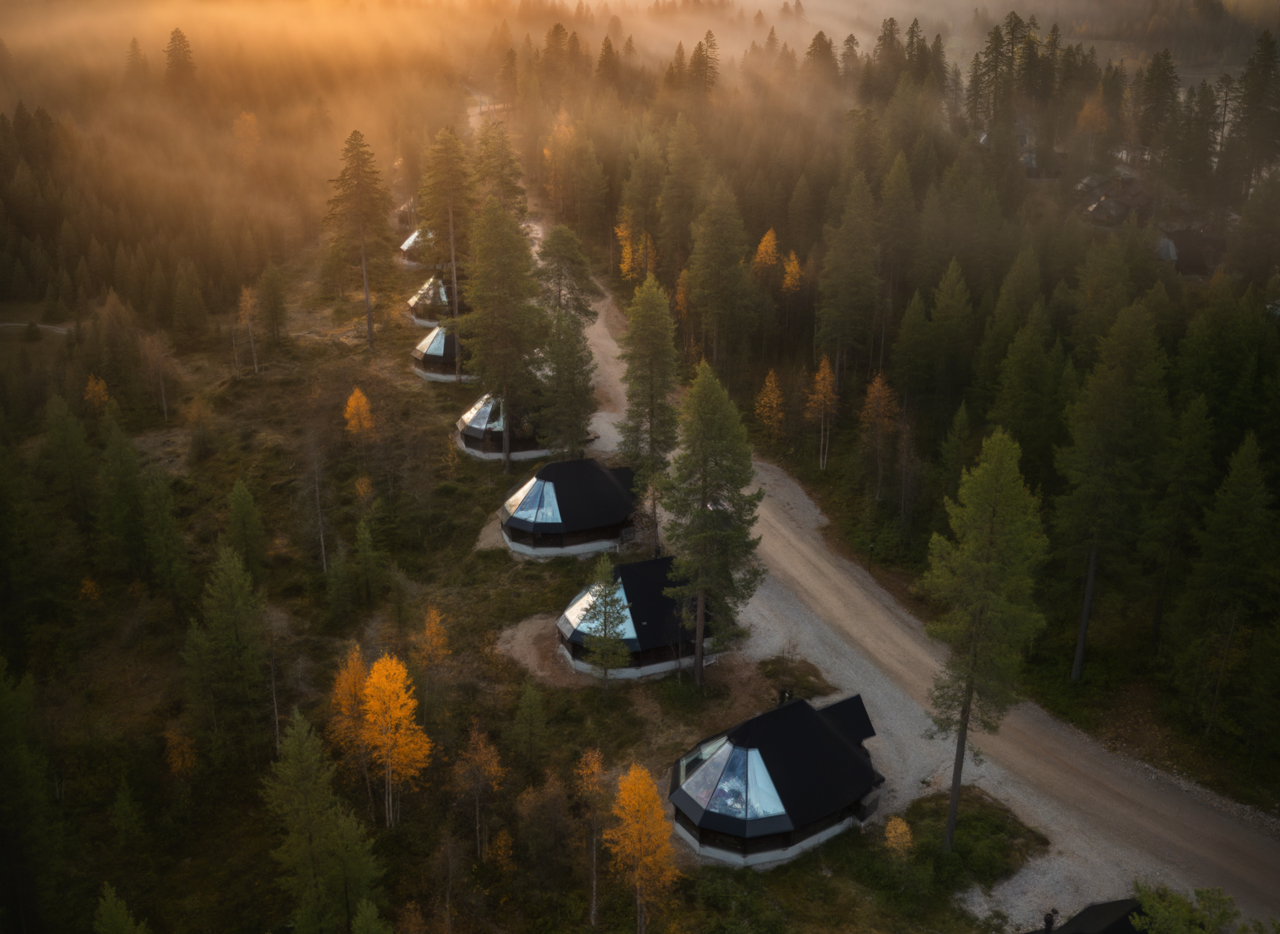 Aurora Village es especialmente conocido por sus cabañas con techo de cristal, diseñadas para integrar el cielo ártico directamente en la experiencia de alojamiento en Laponia. Las cabañas se encuentran en un entorno forestal tranquilo, ofreciendo privacidad sin renunciar al fácil acceso a los servicios y actividades del complejo.