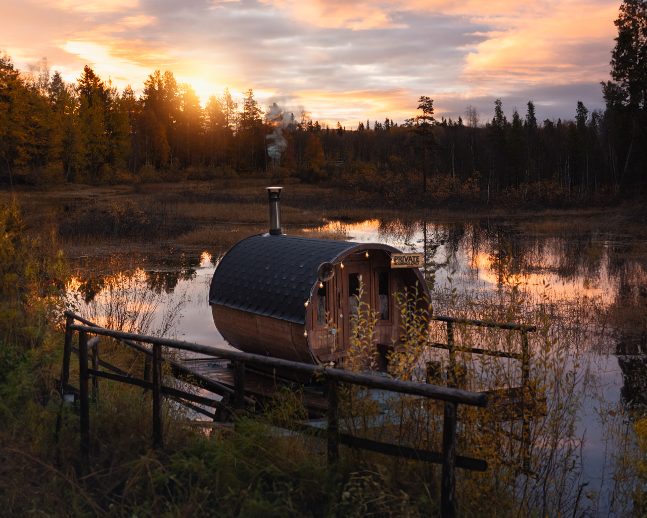 Para una experiencia más tradicional, una sauna de barril calentada con leña ofrece un entorno tranquilo para relajarse. Según la temporada, la experiencia puede incluir también un baño de hielo, proporcionando un refrescante contraste tras el calor de la sauna.