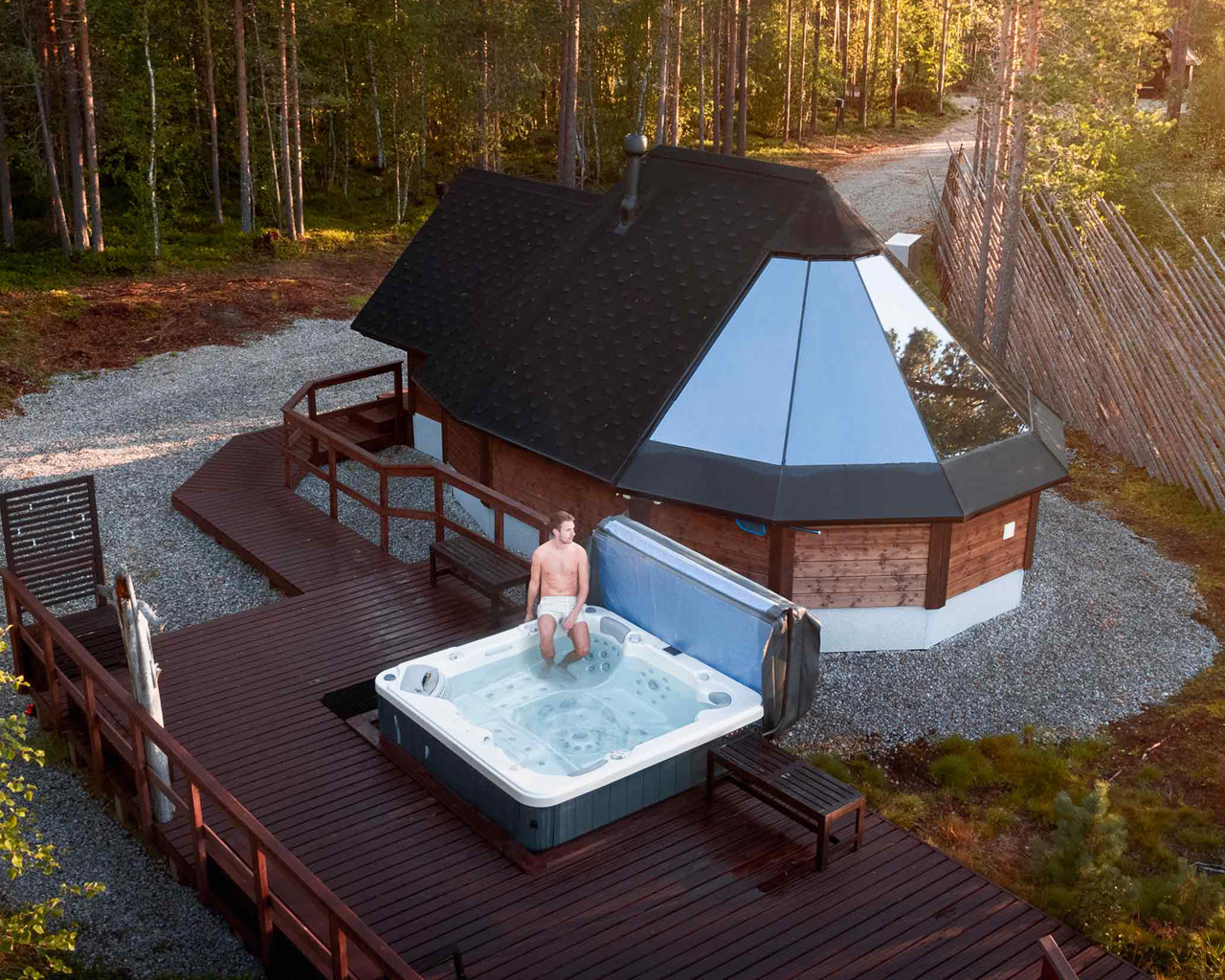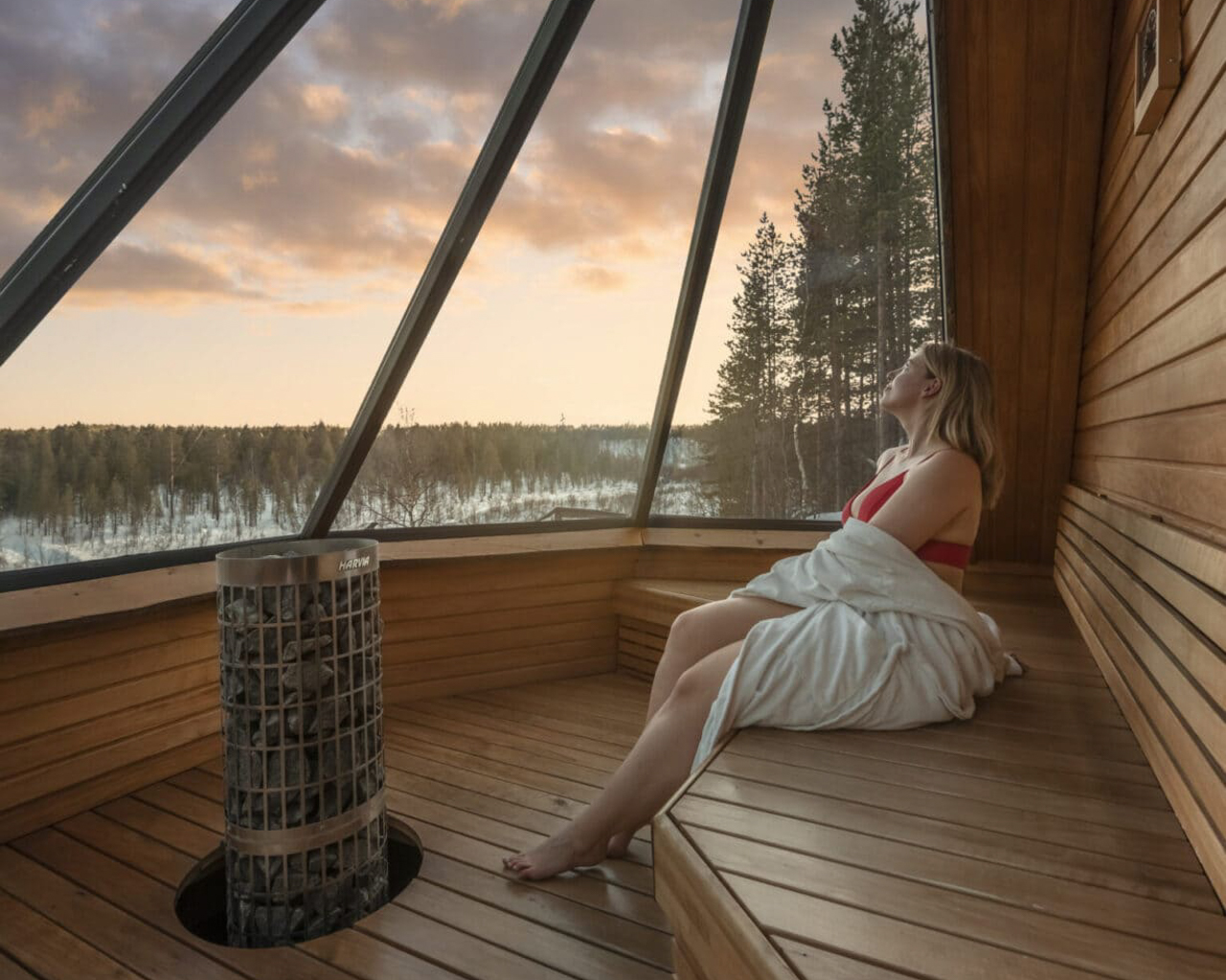Ninguna visita a Finlandia estaría completa sin experimentar la sauna. En Aurora Village, los huéspedes pueden disfrutar de una moderna sauna panorámica con techo de cristal, donde el bosque circundante forma parte de la experiencia, así como de una bañera de hidromasaje exterior en una terraza con vistas.
